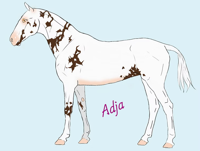 Adja on siro, joutsenkaulainen overo. Laikkukuviota tammalla on melko harvassa, pääosin kasvoissa, ja kaulalla. Laikut ovat väriltään tummansuklaan ruskeat. Kuviot ovat melko symmetriset kehon molemmin puolin. Muutoin tamman ohut karva on puhtaan valkea. Adjan iho on vaalean punainen, eli esimerkiksi tuon turpa, silmänympärykset ovat vaaleanpunaiset. Tamman kaviot ovat myös vaaleat. Silmät ovat ruskeat, mutta taittuvat sävyltään vähän oranssiin. Adjan jouhet, ne harvat mitä tammalla on, ovat valkoiset. Tuo on menneisyydestä johtuen tamma on menettänyt harjansa täysin ja häntäjouhetkin ovat ohuet, ja lyhyenä tupsuna hännänpäässä. Harjan kohdalla Adjan iho näkyy, eli sekin on vaaleanpunainen juova. Jouhet eivät ole kasvaneet takaisin, vaikka Adja olisikin välissä paremmassa kunnossa. Tamman kyky näkyy tuon kehosta. Adja on lihakseton ja laiha, eikä tunnu saavan painoa vaikka kuinka söisi. Adja pitää itseään rumana. Kyky on myös vienyt tuon fyysisen terveyden, joten Adja on usein pahoinvoiva, heikko ja sairastuu herkästi. Rodultaan Adja on akhaltekin ja paintin risteytys, mutta tamma muistuttaa rakenteeltaan enemmän hoikkaa ja korkeaa akhaltekia. Adjan säkäkorkeus on 175cm.
